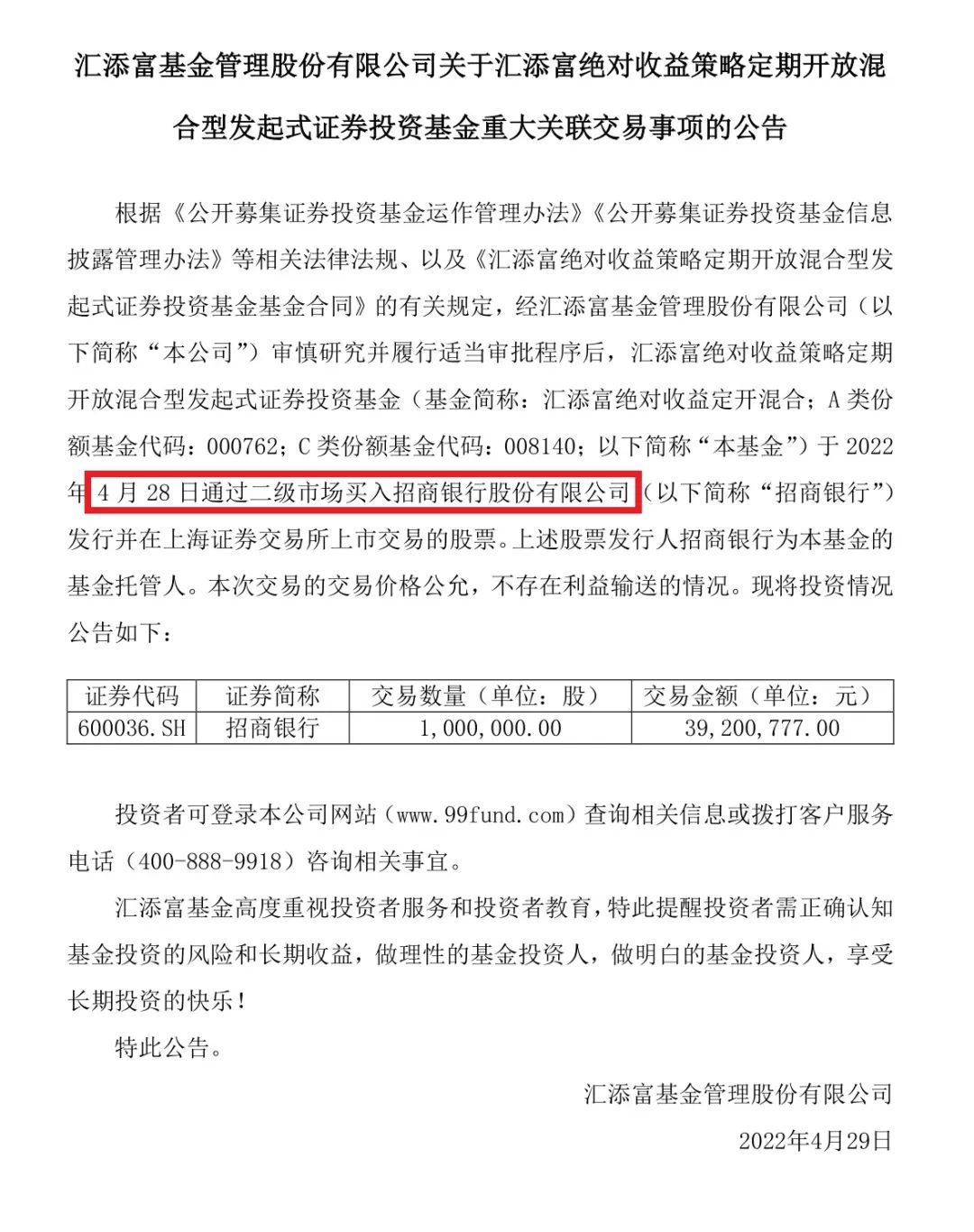 4月29日,汇添富基金发布关于汇添富绝对收益策略定开混合基金重大关联交易事项的公告,公告显示,汇添富绝对收益定开混合基金于2022年4月28日通过二级市场买入招商银行股份有限公司发行并在上海证券交易所上市交易的股票,合计买入100万股,买入金额3920.08万元。