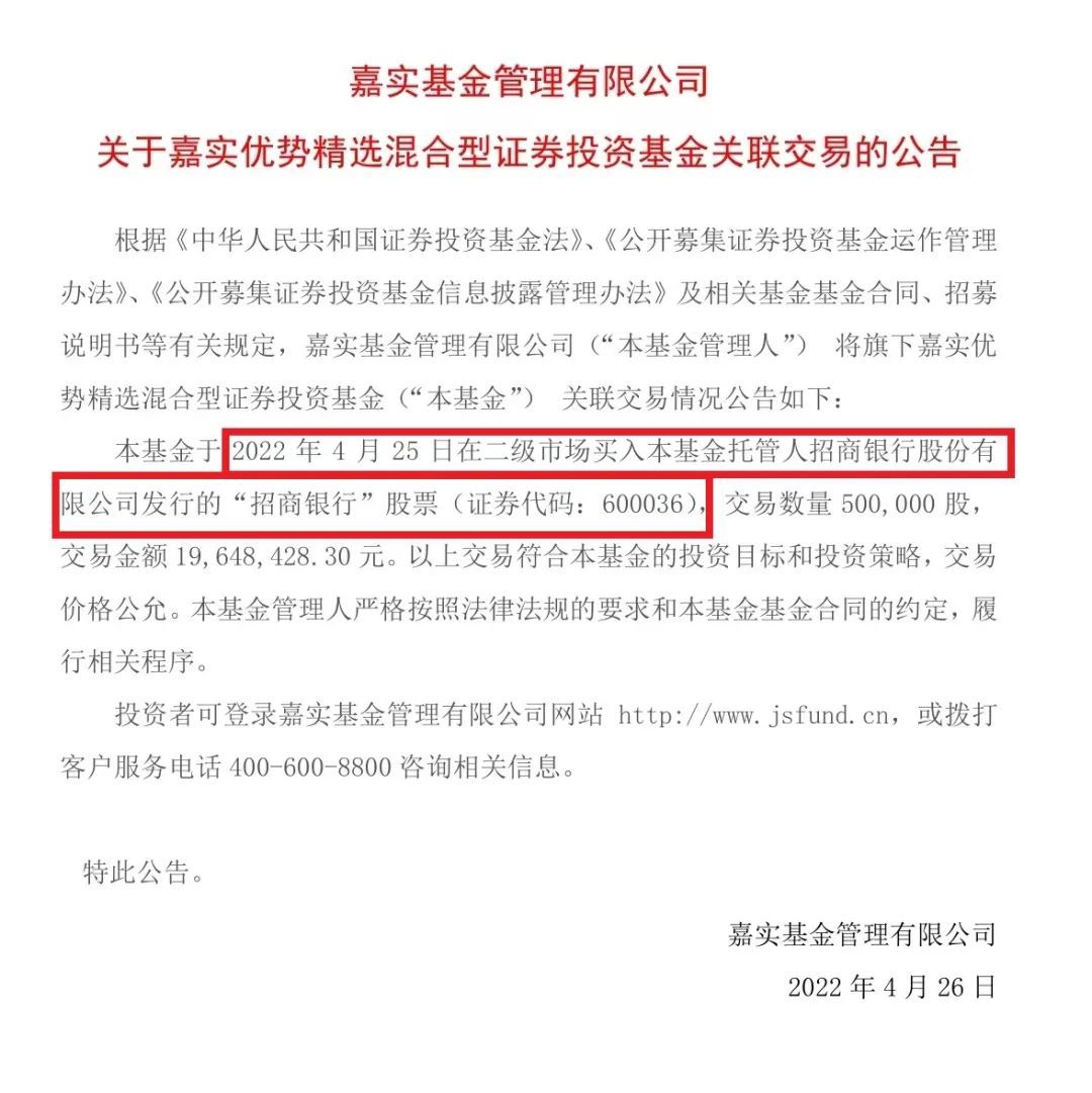 事实上,近日出手“抄底”招行的不止汇添富,早在4月26日,嘉实基金公告,嘉实优势精选混合于2022年4月25日在二级市场买入托管人招商银行股份有限公司发行的“招商银行”股票(证券代码:600036),交易数量 500,000股,交易金额19,648,428.30元。