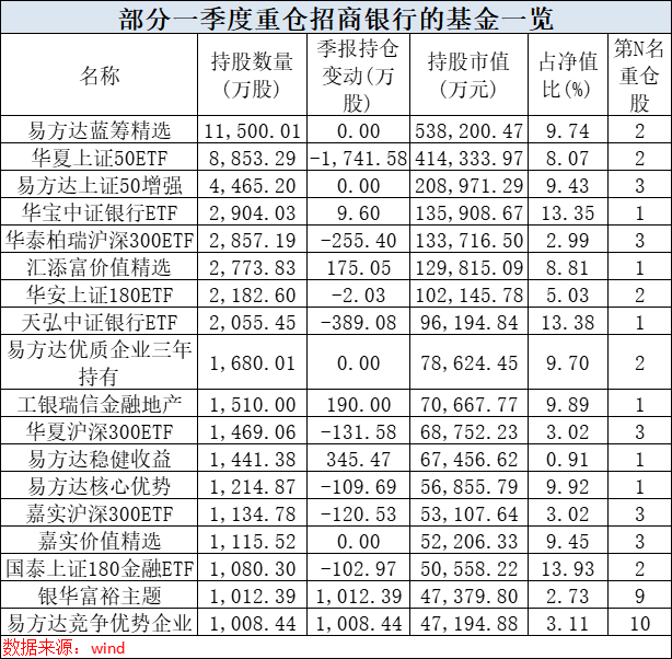 易方达、汇添富、嘉实、鹏华、银华是持有招商银行最多的五家公司,持股市值分别为968018.36万元、424853.94万元、356991.58万元、136198.37万元、92187.6万元。