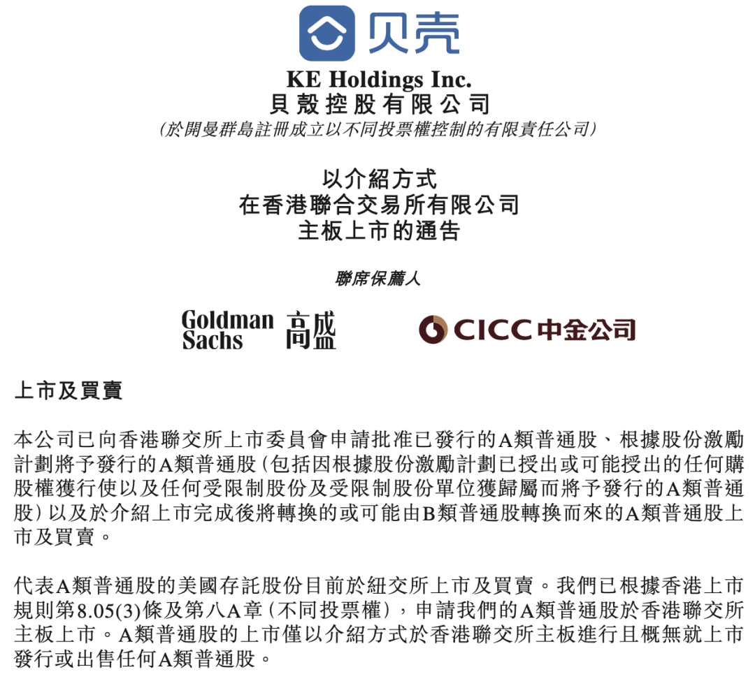 根据公告,贝壳的A类普通股将于5月11日开始在港交所买卖,股份代号为“2423.HK”。值得关注的是,贝壳此次回港采用的是“双重主要上市+介绍上市”的方式。