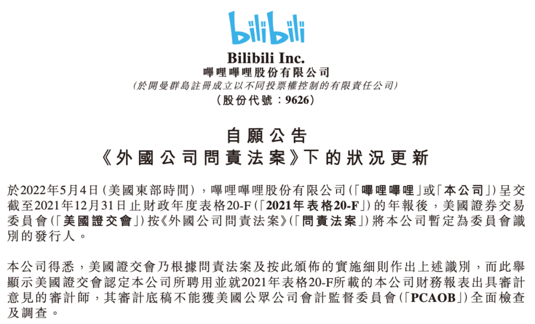B站近期亦发布公告称,其此前争取自愿转换至在港交所主板双重主要上市的申请,已于4月29日收到联交所确认,预期在10月3日于港交所及美国纳斯达克双重主要上市。而就在5月4日,SEC再度公布中概股“预摘牌名单”,一口气列入了包括B站在内的88家中概股公司。