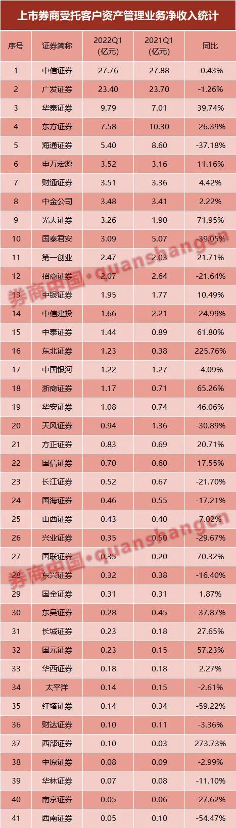 若以合并利润表中“资产管理业务手续费净收入”指标来衡量上市券商的资管业务收入(下同),则2022年一季度,41家上市券商资管业务收入合计为112亿元,同比下滑2.3%。其中21家上市券商资管业务收入出现了同比下滑,占比过半!
