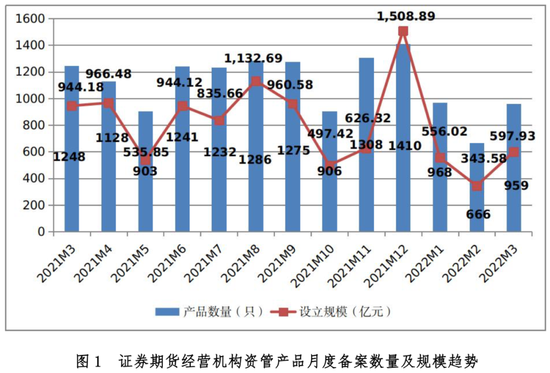 就在上市券商一季度资管业务预警的同时,中基协发布的最新数据显示,2022年3月,证券期货经营机构当月共备案私募资管产品959只,设立规模597.93亿元,3月设立规模环比增加74.03%,但同比减少36.67%。