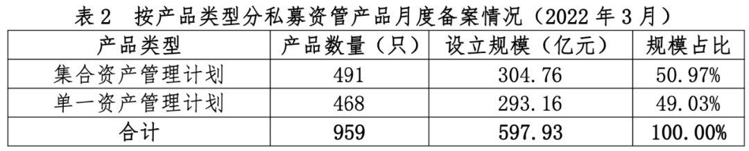 从产品类型看,3月备案的集合资管计划设立规模为304.76亿元,占比50.97%,仅略高于单一资管计划。而在2021年12月至2022年2月,这一占比分别为60.87%、57.77%、62.06%,均明显高于3月数值。