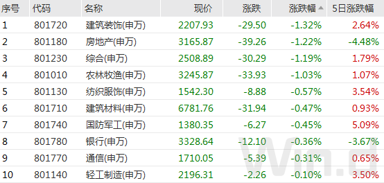 从下跌板块来看,建筑装饰、房地产、综合、农林牧渔等板块跌幅居前。