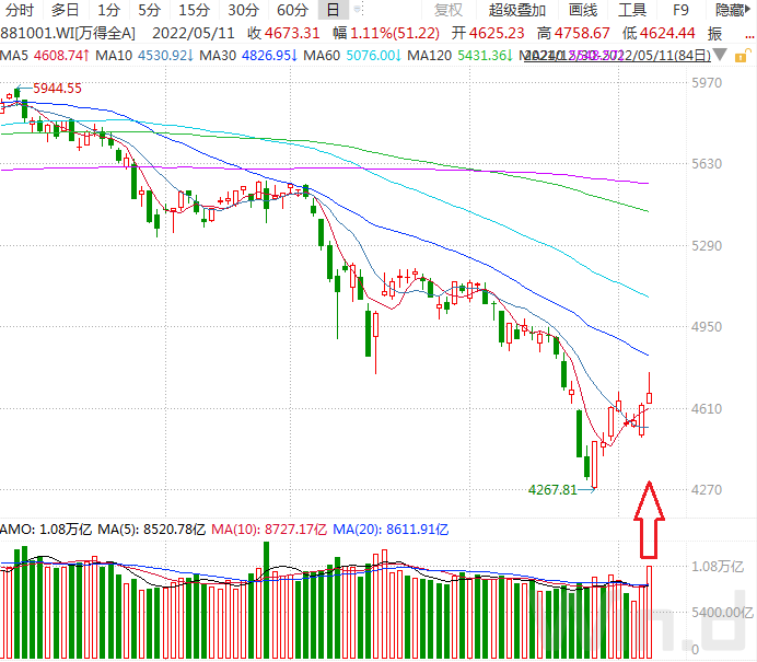 5月11日,万得全A高开高走,涨幅为1.11%,全天成交额为1.08万亿,较前一交易日大幅放量,时隔一个多月,A股成交额再度站上万亿关口,底部区域量价齐升,投资者风险偏好有望持续回升。
