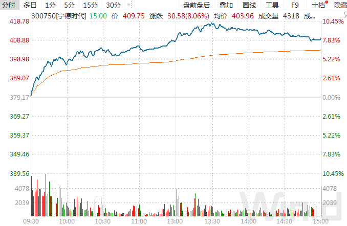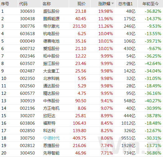 从涨幅居首的电力设备板块来看,盛弘股份、鹏辉能源、帝尔激光、杭电股份、德赛电池、爱旭股份、柘中股份、振江股份、大金重工、北京科锐、通达股份、精达股份等10多只个股涨停或涨幅超过10%,板块龙头宁德时代涨幅亦高达8.06%。