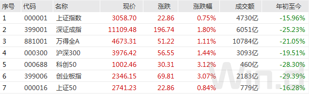 截至5月11日收盘,上证指数涨0.75%报收于3058.70点;深成指涨1.80%报收于11109.48点;创业板指涨3.07%报收于2346.15点,万得全A总成交1.08万亿。