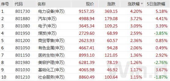 5月11日,由于A股市场整体反弹,行业板块亦多数数上涨。其中,电力设备板块大幅上涨4.20%,位居首位;汽车、电子、煤炭、商贸零售、有色金属等多个板块涨幅超过2%。