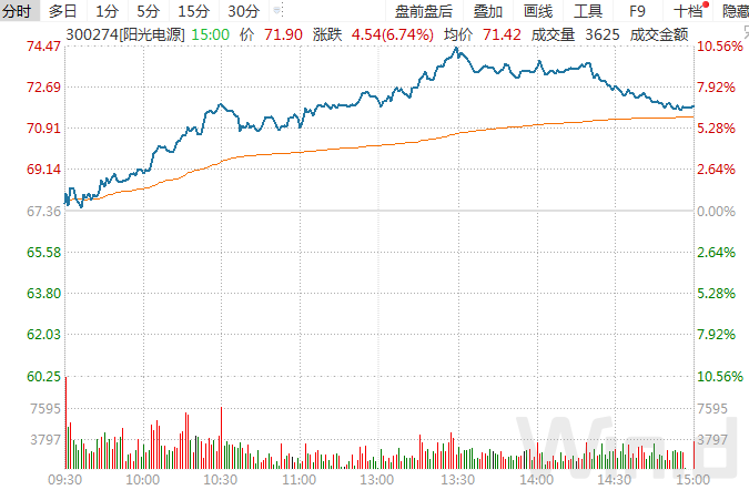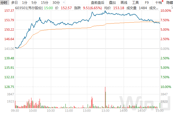 此外,半导体龙头韦尔股份亦大涨6.65%,盘中也一度涨停;光伏龙头阳光电源涨幅达6.74%,盘中涨幅一度超过10%。