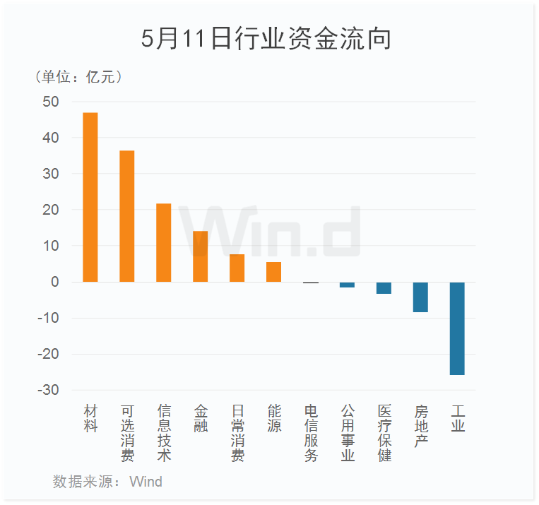 从5月11日行业资金流向来看,主力资金净流入90多亿元,多数行业净流入,其中材料板块净流入额超40亿元,位居首位;可选消费、信息技术、金融等板块净流入亦较高。工业、房地产、医疗保健等板块则净流出。