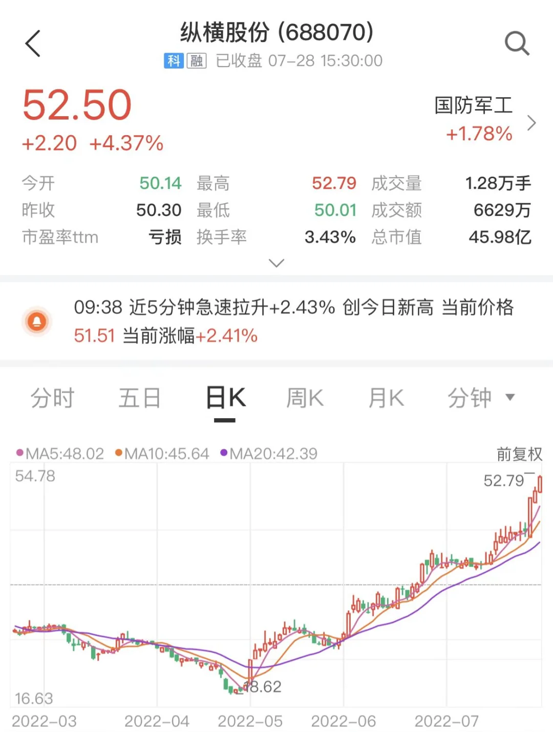 7月28日,纵横股份盘中创下阶段新高52.79元/股,收盘报52.5元/股,涨幅为4.37%。