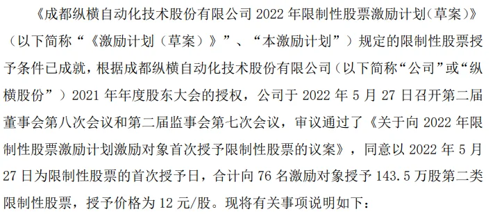 纵横股份5月28日公告称,根据公司2021年年度股东大会的授权,公司于5月27日召开董事会和监事会,审议通过了《关于向2022年限制性股票激励计划激励对象首次授予限制性股票的议案》,同意以5月27日为限制性股票的首次授予日,合计向76名激励对象授予143.5万股第二类限制性股票,授予价格为12元/股。