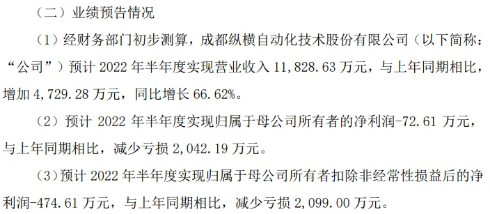 纵横股份7月18日晚发布2022年半年度业绩预告,预计上半年实现营业收入1.18亿元,同比增长66.62%;预计实现归属于母公司所有者的净利润为亏损72.61万元,上年同期为亏损2114.8万元。