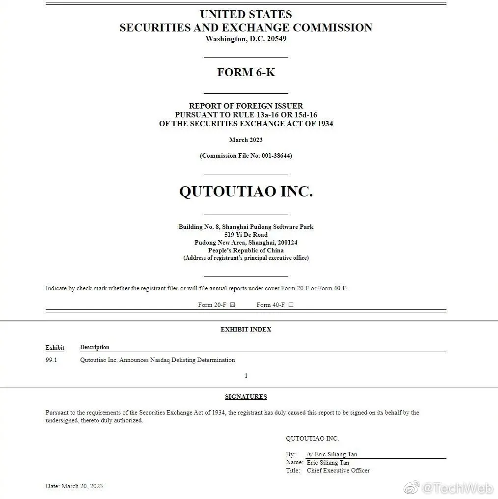 趣头条于 3 月 14 日收到了纳斯达克关于将股票退市的决定函,根据上市规则,上市公司的市值至少为 100 万美元(当前约 688 万元人民币)时,该公司无法重新获得 180 天宽限期后合规。